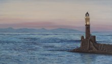 “In the attitude of silence the soul finds the path in a clearer light, and what is elusive and deceptive resolves itself into crystal clearness. Our life is a long and arduous quest after Truth” – Mahatma Gandhi. Painting of Lighthouse in Crete, Greece